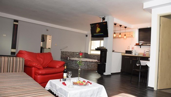 במתחם שתי סוויטות גדולות ומרווחות המעוצבות בסגנון מודרני עם ריהוט איכותי היוצר אווירה מיוחדת המשתלבת עם המקום: מיטה זוגית ורכה, חדר רחצה רחב, ג'קוזי מעוצב עם תאורה רומנטית ונרות ריחניים, סלון עם פינת ישיבה איכותית, lcd עם זרוע מתכווננת, מערכת קולנוע ומבחר סרטים מכל הסוגים. עוד בסוויטה, מטבחון מאובזר עם מכונת אספרסו עשירה.