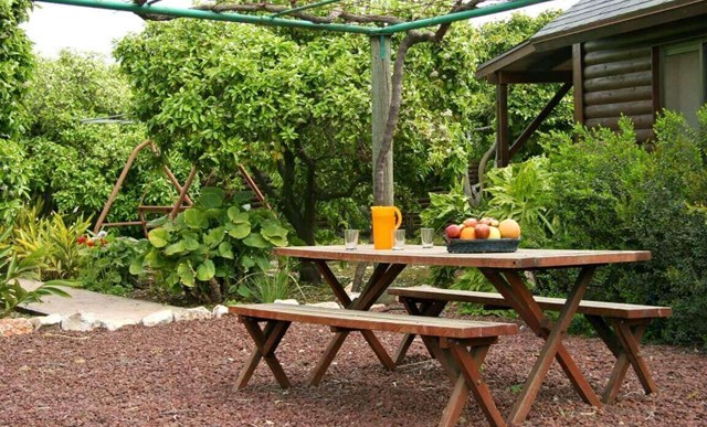 ביציאה מהבקתות מחכה לכם חצר ירוקה עם פרחים צבעוניים, ג'קוזי מפנק ומרווח הצופה לפרדס, מדשאה רחבה ופינות ישיבה פזורות, ערסלים ופינת תבלינים ריחנים לשימושכם והנאתכם.
