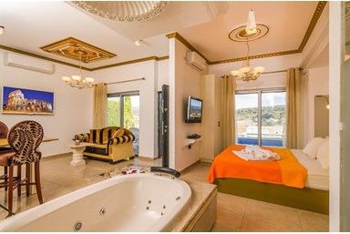 סוויטה בעיצוב מפואר בגווני זהב ולבן, עם ריהוט יוקרתי המיובא מחו"ל ומיטב האבזור להשלמת חווית החופשה: